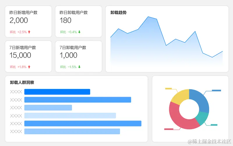 华为分析基于硬件层面的数据采集,可以提供给开发者卸载人群的用户特征、卸载前的用户行为分析等,为定位卸载原因提供依据,在我们的平台上,可以直接监控每天的新增用户数、卸载用户数,直观的监控到我们App的用户增长情况是否健康。