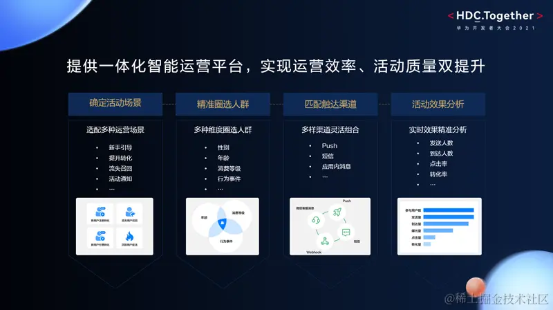 基于策略,就可以在平台上通过Push、短信、IAM等服务手段完成精准触达,同时,平台还支持运营活动的复盘,分析服务支持对整个运营活动的过程数据和结果数据全程监控,可以帮助开发者和运营人员全面复盘,更高效的进行活动策略的调优和迭代。