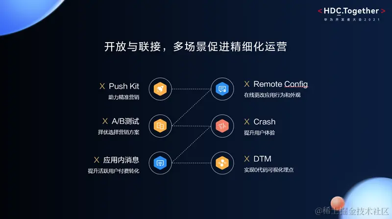 除了以上几个典型的应用场景外,华为还有一个很大的优势就是,是与华为开发者后台的生态是打通的,基于华为分析的数据基座,可以和AGC上的多款服务联通。包括Push、Crash等等,感兴趣的开发者可以登录到华为开发者后台去体验下我们的产品能力。