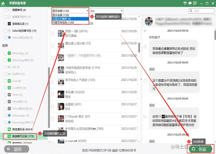 - 数据蛙苹果恢复专家扫描结束后,iPhone手机上的数据都会显示出来,要想恢复微信聊天记录,左侧目录中点击【微信】,右边就是微信的数据。在中上方选择‘只显示已删除’后可以看到删除的微信聊天记录,勾选所需要恢复的内容,点击右下侧的【恢复】,即可完成微信聊天记录的恢复。