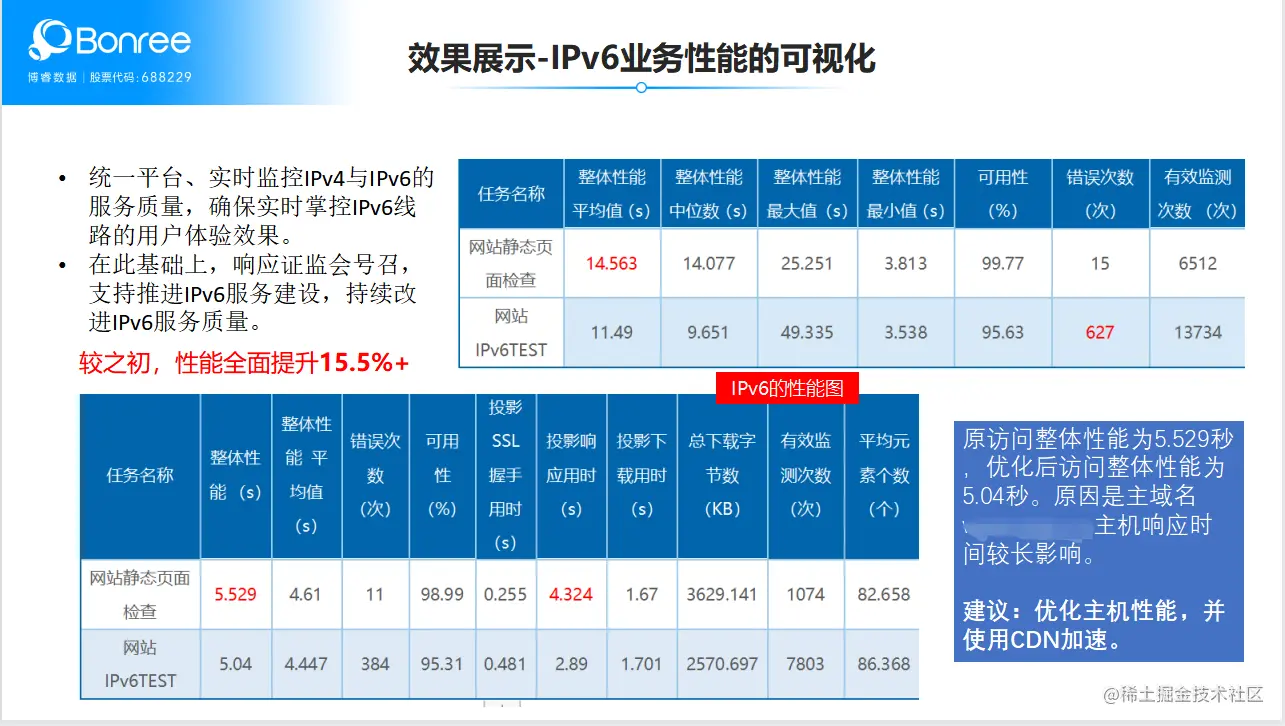 测试结果明显提升,IPv6的服务性能已达到监管部门要求,性能全面提升超过15.5%。