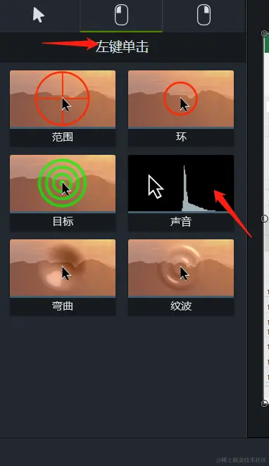 我们点击“光标效果”的工具栏上方的第二个鼠标样式的选项,就还可以对左键单击进行一些效果应用。Camtasia系统为用户提供了“范围”、“环”、“目标”、“声音”、“弯曲”、“波纹”这六种左键单击效果。