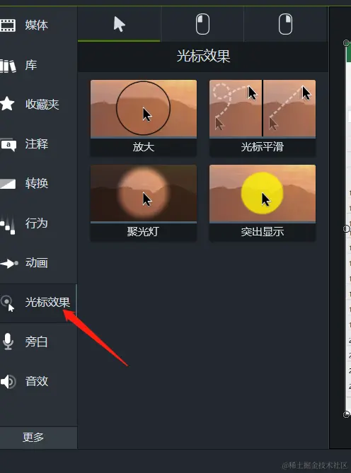 首先我们在工具栏中找到“光标效果”,点击上方的第一个箭头标识,如图4所示,这个界面就是应用光标效果的界面。Camtasia系统提供了“放大”、“光标平滑”、“聚光灯”、“突出显示”这四种效果。我们可以任选其中一个将其应用到视频中。