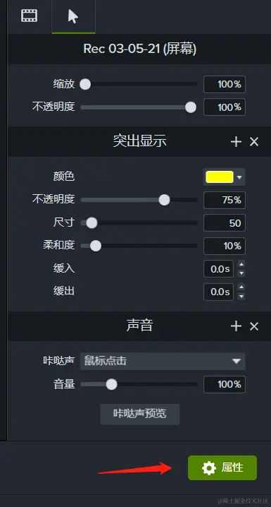 同样,Camtasia也为用户提供了自行设置效果属性的区域。在画布的右下方有一个绿色的“属性”按钮,点击后可以出现编辑光标效果属性的界面,如图8所示。在此我们可以编辑光标效果的尺寸、颜色、不透明度等,按照自己的喜好调整即可。