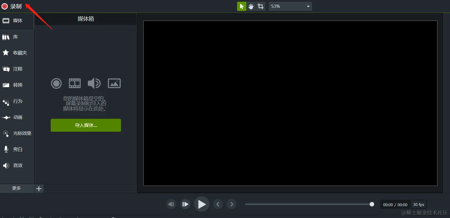 首先我们要对需要讲解的课程进行屏幕录制。打开Camtasia,左上角有一个红色的录制按钮。点击后就可以开始进行屏幕录制了。