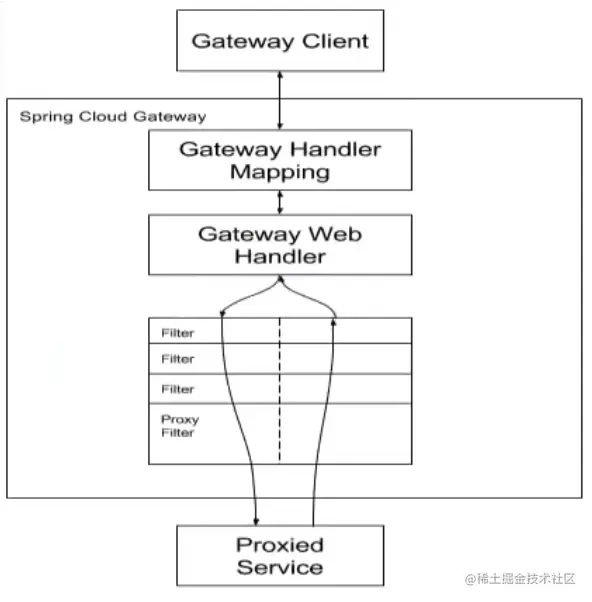3.Gateway Web Handler再通过指定的过滤器链将请求发送到我们实际的微服务执行业务处理(发送代理请求),然后返回