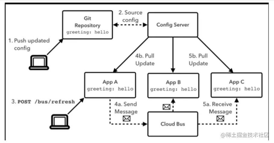 下图中通过调用某个Config client的 /bus/refresh接口,通过消息总线逐渐传播给其他服务,通知它们获取新的配置。(不建议这种方式,打破了微服务的职责单一性,服务费本身是业务模块,刷新配置有基础设施完成更加合理)