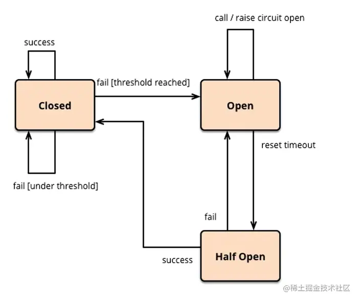 熔断状态迁移: Closed -> Open -> Half Open -> Closed/Open