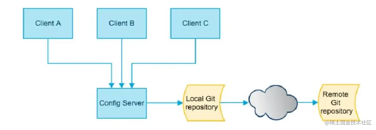 ConfigClient实例都监听MQ中的同一个Topic(默认是SpringCloudBus),当一个服务刷新数据的时候,新的信息放入到Topec中,监听Topic的其他服务会收到通知,然后更新自身配置