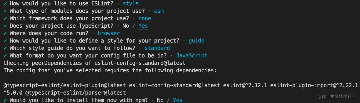 基本的下载和初始化Getting Started with ESLint。--init 命令会进入一堆设置选项,包括代码运行环境、是否使用 react/vue 框架、是否使用ts、代码风格设置等,可以根据个人需求来快速初始化出不同的配置,并会提示安装相应的依赖包。这使得我们可以以非常低的成本用上社区中的优秀实践。