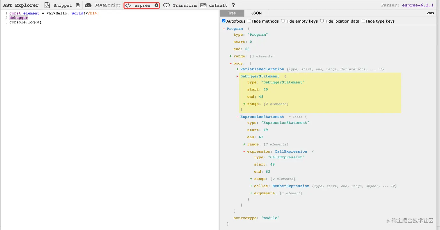 ESLint 默认使用 espree 来解析我们的 JS 语句,来生成AST,可以通过AST explorer 来查看一段代码被解析成AST之后的结构。