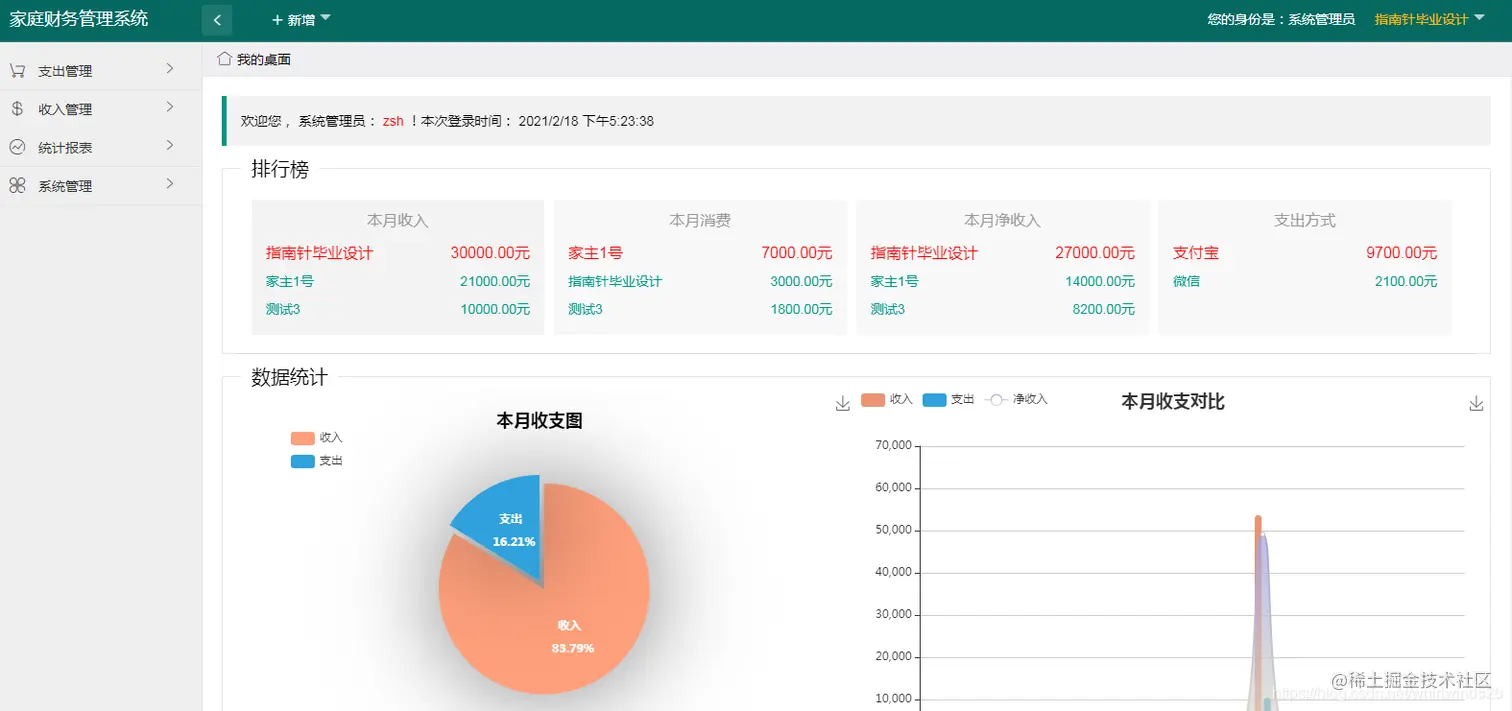 本系统主要实现家庭财务管理,对一个家庭的收入支出进行有效管理,共分三个角色:
