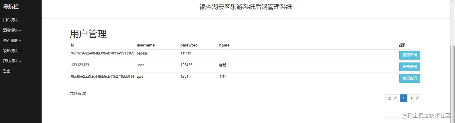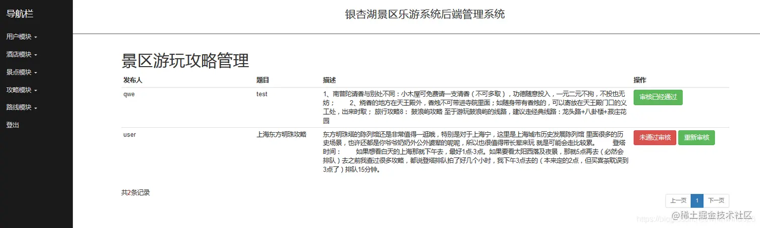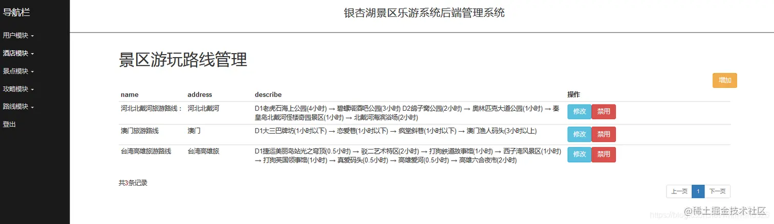 后台系统可以进行用户管理,景点管理,线路管理,攻略审核管理等操作。