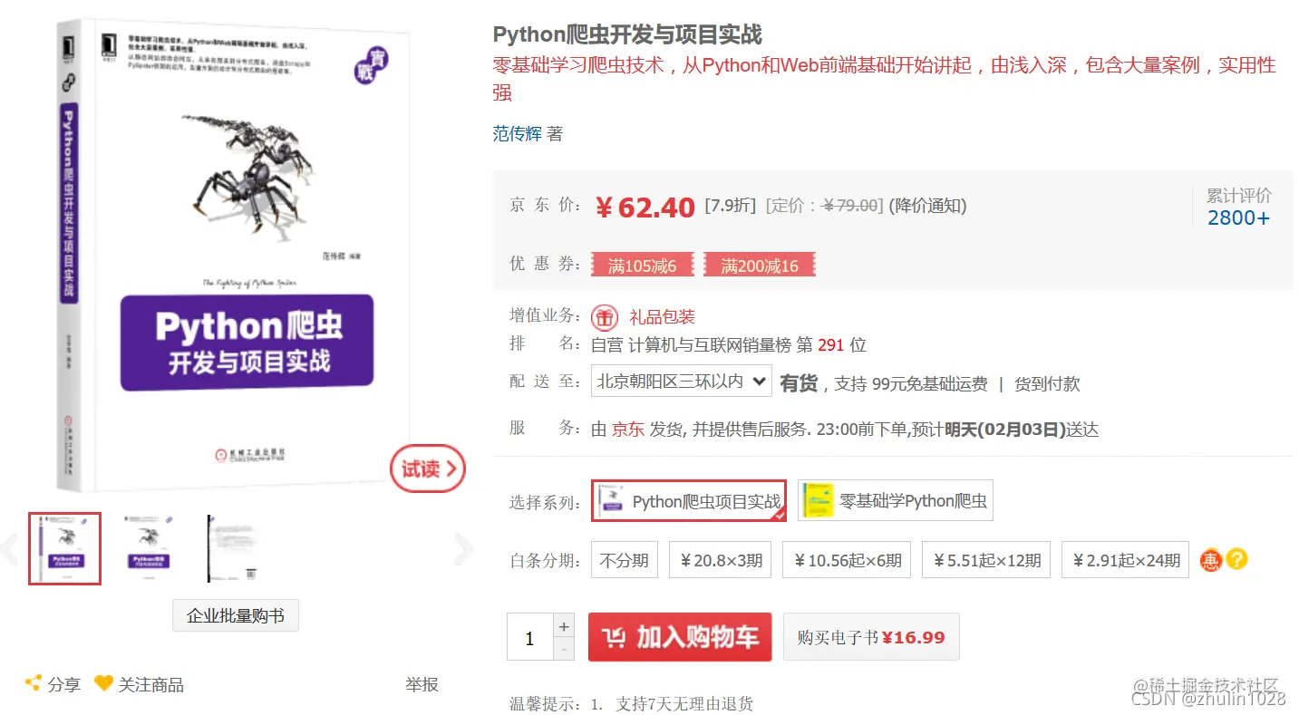 这是京东上看一本书的场景。我们发现打开一本书之后,书的价格,排名等信息及书的评论信息不是在我们第一次打开网站时就立即加载进来的。而是通过二次请求或多次的异步请求获取的。这样的页面就是动态页面。