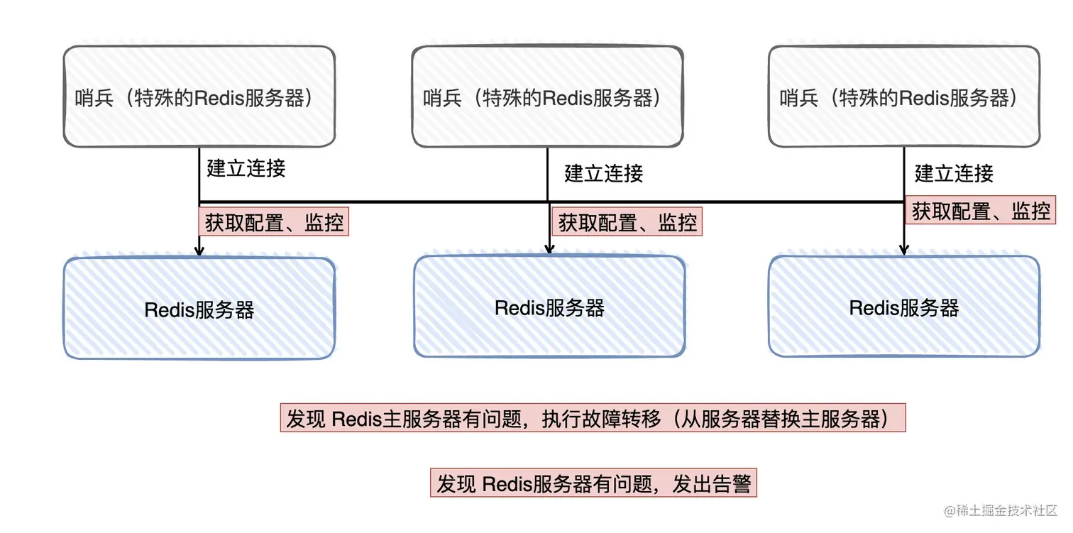 - 哨兵可以理解为特殊的Redis服务器,一般会组成哨兵集群