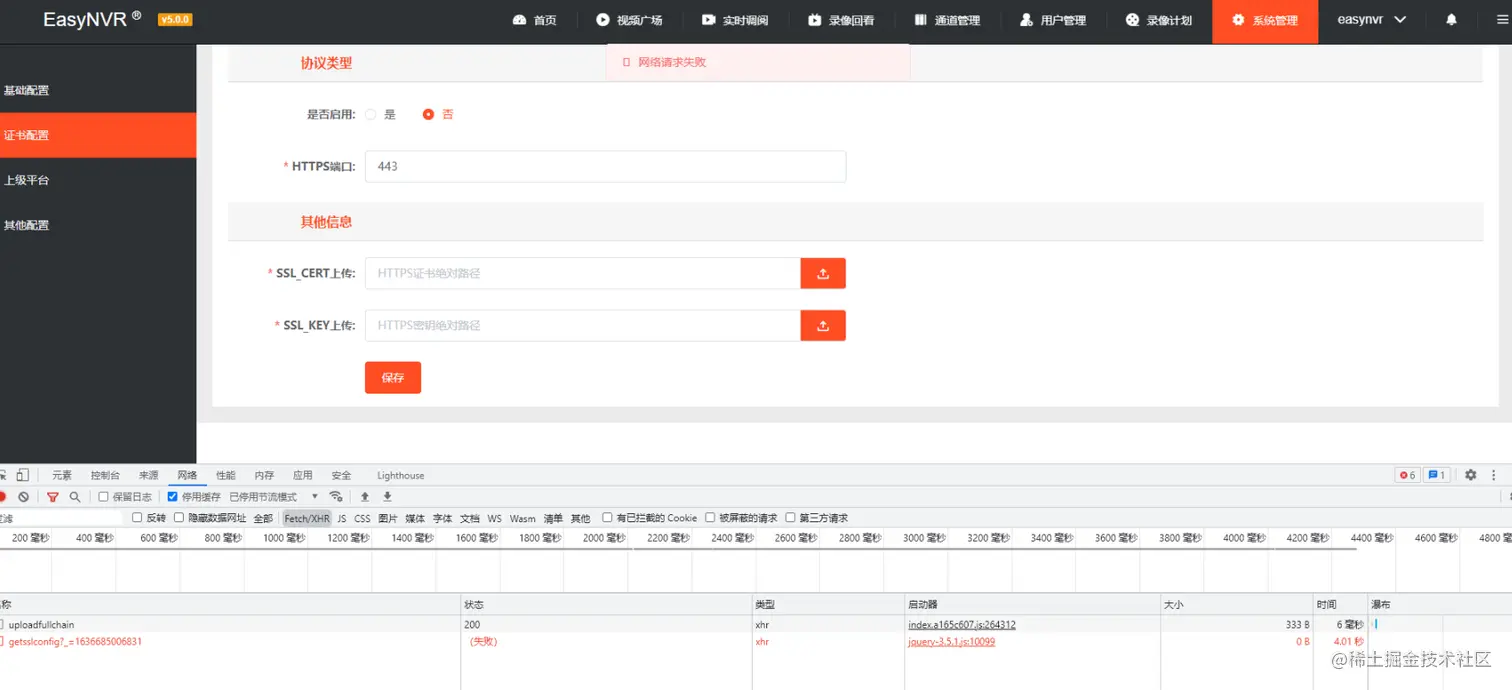 在上传ssl证书时出现了网络请求失败错误,显示如下:
