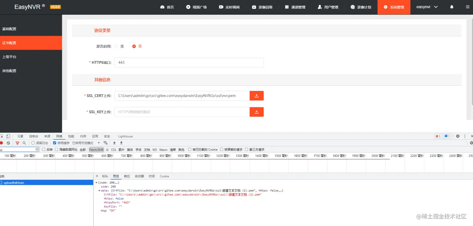 关于开发证书配置(Certificates & Identifiers & Provisioning Profiles),相信做开发的同学没少被折腾。只有拥有开发者账号,才可以申请开发/发布证书及相关配置授权文件。我们在开发EasyNVR的时候也加入了证书配置功能,在配置界面可上传域名证书文件。