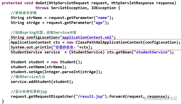 - 当表单提交,跳转到 success.jsp 后,多刷新几次页面,查看后台输出,发现每刷新一次 页面,就 new 出一个新的 Spring 容器。即,每提交一次请求,就会创建一个新的 Spring 容 器。对于一个应用来说,只需要一个 Spring 容器即可。所以,将 Spring 容器的创建语句放 在 Servlet 的 doGet()或 doPost()方法中是有问题的。