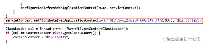 并且,将创建好的容器对象放入到了 ServletContext 的空间中,key 为一个常量: WebApplicationContext.ROOT_WEB_APPLICATION_CONTEXT_ATTRIBUTE。