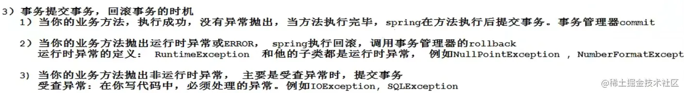 - Spring 事务的默认回滚方式是:发生运行时异常和 error 时回滚,发生受查(编译)异常时提交。 不过,对于受查异常,程序员也可以手工设置其回滚方式。