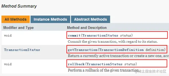 - 事务管理器是 PlatformTransactionManager 接口对象。 其主要用于完成事务的提交、回 滚,及获取事务的状态信息。