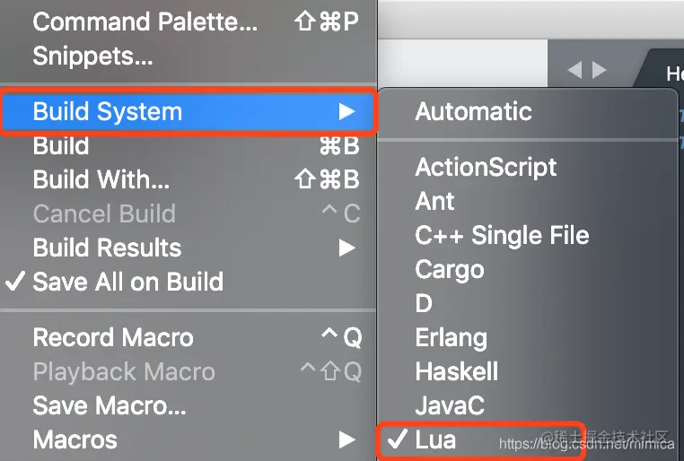 保存为Lua.sublime-build,然后通过菜单[Tools]→[Build System]上就能选择lua来编译脚本。