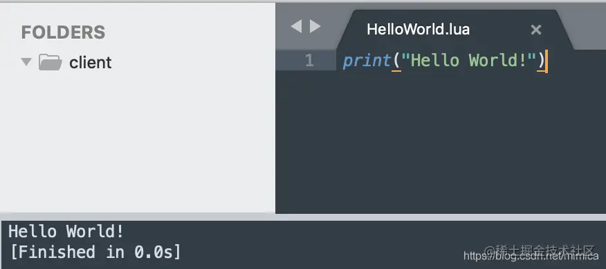 新建一个HelloWorld.lua文件,选择Lua为build system,按一下 command+b,就编译出lua脚本。
