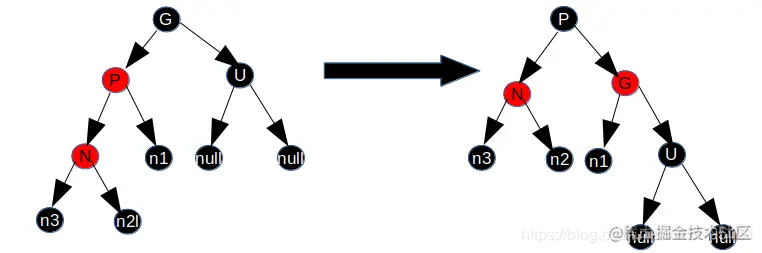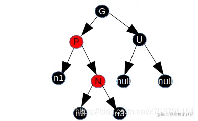 4.2 P是红色,U是黑色。并且,N是P的左子节点,P是G的左子结点,如下图: