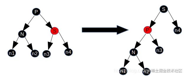 进行一次左旋操作,左旋操作可以这样理解:将N节点替换P节点的位置(N节点成了P节点),P节点成为N节点的左子节点,而N节点原本的左子节点成为P节点的右子节点,如下图: