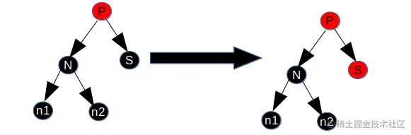 其实上面的操作,是因为P-n1路径上少了个黑色节点,那就借一个过来,同时还不能影响原来P的右子树下的黑色节点数量,但是这样处理的话还不能算完,还要往下走。