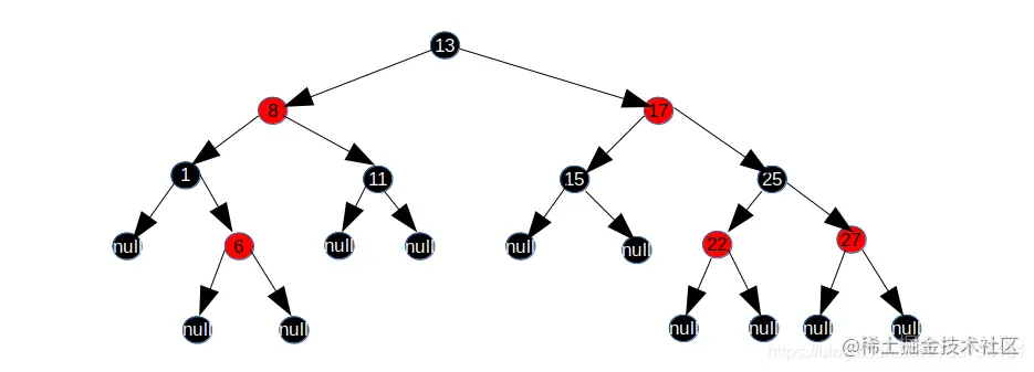 下图是红黑树的一个示例,它的中序遍历的结果是:1,6,8,11,13,15,17,22,25,27,本文就围绕它进行算法描述的示例。