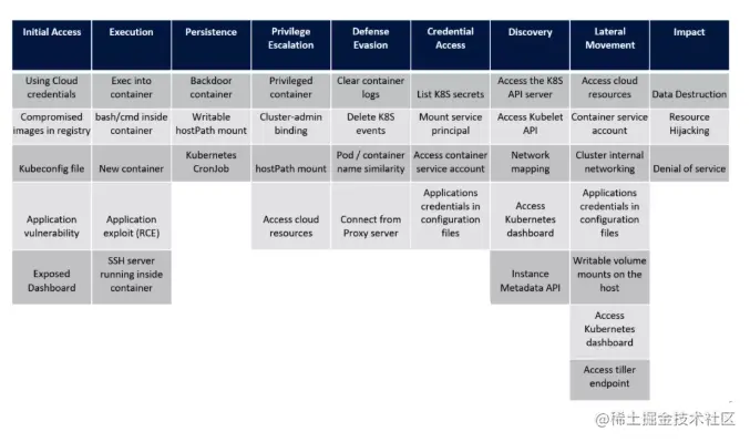 基于 Kubernetes 容器集群的安全考量,它的攻击面很多。所以我们要想做一份完备的安全策略,依然需要借助在系统层面的安全经验作为参考。根据业界知名的 MITRE ATT&CK 全球安全知识库的安全框架设计,我们有如下方面需要考量: