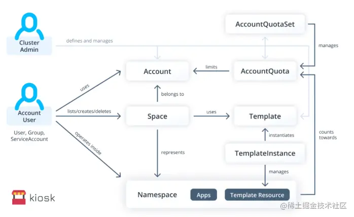 Kubernetes 内部的账号系统有 User、Group、ServiceAccount,当我们通过 RBAC 授权获得资源权限之后,其实这 3 个资源的权限能力是一样的。因为使用场景的不同,针对人的权限,我们一般会提供 User、Group 对象。当面对 Pod 之间,或者是外部系统服务对 Kubernetes API 的调用时,一般会采用 ServiceAccount。在原生 Kubernetes 环境下,我们可以通过 Namespace 把账号和资源进行绑定,以实现基于 API 级别的多租户。但是原生的多租户配置过于繁琐,一般我们会采用一些辅助的开源多租户工具来帮助我们,例如 Kiosk 多租户扩展套件: