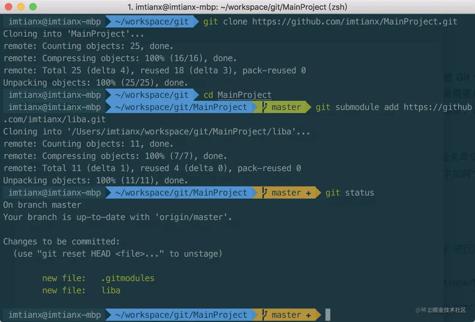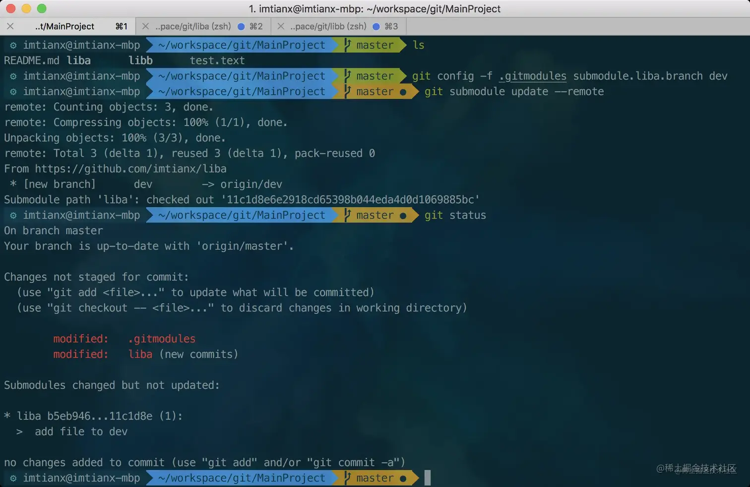 可以使用 git submodule --help 查看所有相关命令。 为了方便说明,这里在主项目 MainProject 中加两个子模块 liba 和 libb 。