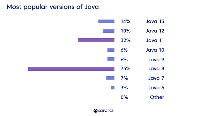 Java 8 和 11 仍是目前最有用的更新。根据JetBrains 2020年的调查,75%的调查对象选择Java 8,Java 11则排在第二位。