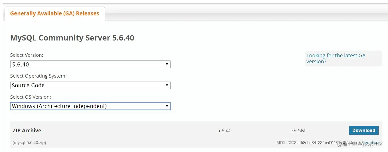 这里我选择的是 5.6.40 版本,操作系统下拉列表里选 Source Code,OS Version 选择 Windows(Architecture Independent),然后就可以下载打包好的 zip 源码了。