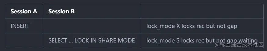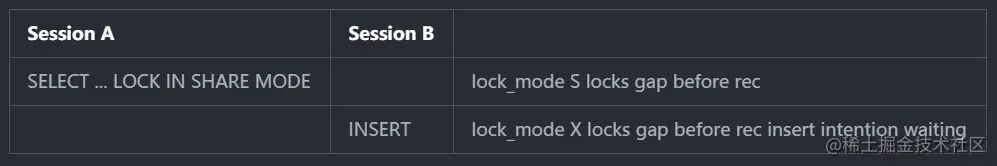 所以,根本就不存在之前说的先加插入意向锁,再加排他记录锁的说法,在执行 insert 语句时,什么锁都不会加。这就有点意思了,如果 insert 什么锁都不加,那么如果其他事务执行 select ... lock in share mode,它是如何阻止其他事务加锁的呢?