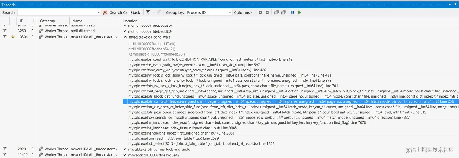 这里列出了 3 个 RW-LOCK:000002C97F62FC70、000002C976A3B998、000002C976A3B8A8。其中可以看到最后一个 RW-LOCK 有其他线程在等待其释放(Waiters for the lock exist)。下面列出了所有等待该锁的线程,Thread 10304 has waited at btr0cur.cc line 256 for 26.00 seconds the semaphore,这里的 Thread 10304 就是我们正在执行 select 语句的线程,它卡在了 btr0cur.cc 的 256 行,我们查看 Thread 10304 的堆栈:
