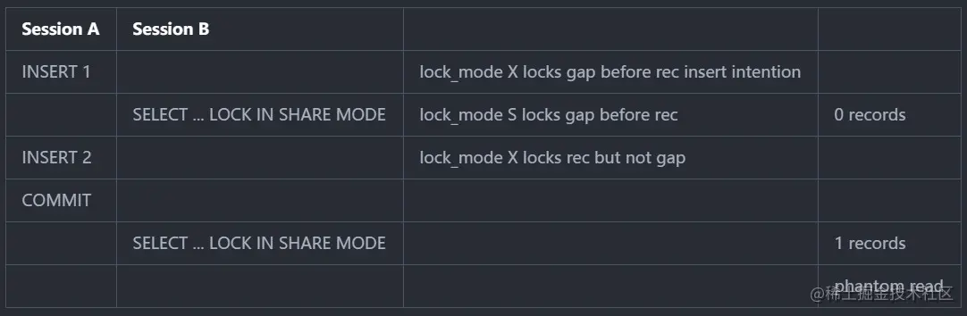 那么问题就来了,如果在 insert 语句加插入意向锁之后,写数据之前,执行了 select...lock in share mode 语句,这个时候 GAP 锁和插入意向锁是不冲突的,查询出来的记录数为 0,然后 insert 语句写数据,加 X 记录锁,因为记录锁和 GAP 锁也是不冲突的,所以 insert 成功插入了一条数据,这个时候如果事务提交,select...lock in share mode 语句再次执行查询出来的记录数就是 1,岂不是就出现了幻读?