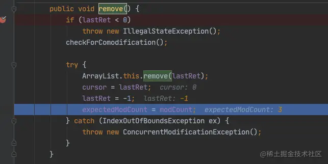 为了方便说明,我把步骤标明了一下,我们发现第1、2、4步执行的方法和前面“异常使用”的流程是一模一样的,但是第3步中有个remove()方法,这个其实是Iterator的remove()方法,然后第4步remove()方法其实是List的remove()方法,两个是嵌套关系。当执行完List的remove()方法后,Iterator的remove()方法会执行“第5步”的“expectedModCount = modCount”,重新让两者相等,这就是使用迭代器删除数据,不会抛出异常的原因所在。