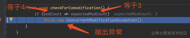 整个流程非常清晰,其实就是因为List中维护了一个变量expectedModCount,该变量是List的初始大小,当你新增或者删除元素时,会修改临时变量modCount的值,每次循环时,Java会判断两个值是否相等,如果不相等,就会抛出异常。