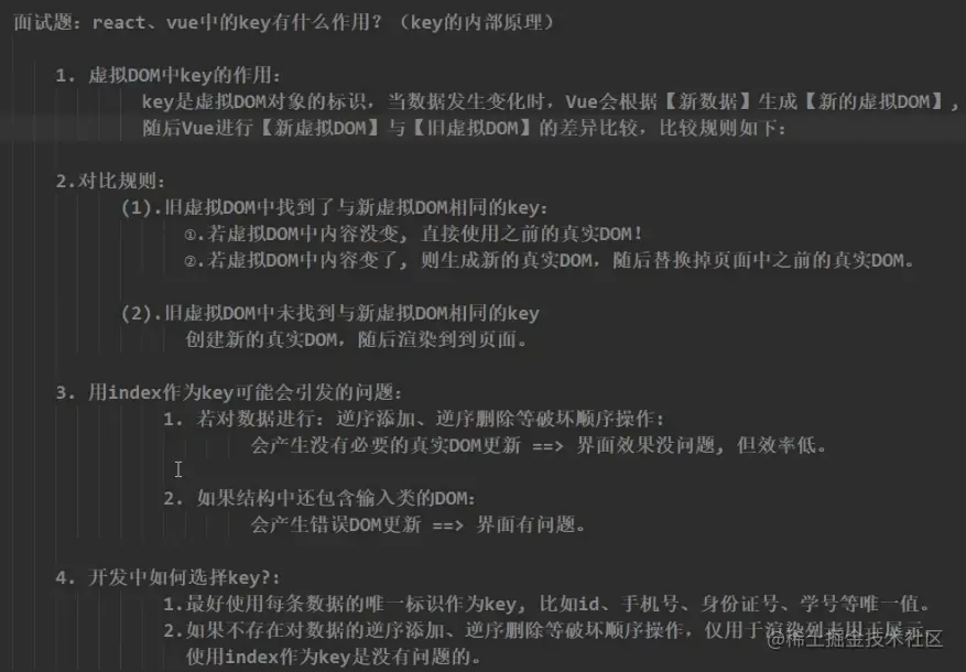 新旧虚拟DOM对比,若某一个元素的内容及属性完全一致,则不用通过新的虚拟DOM转化为真实DOM,而是直接复用旧虚拟DOM转化过的真是DOM