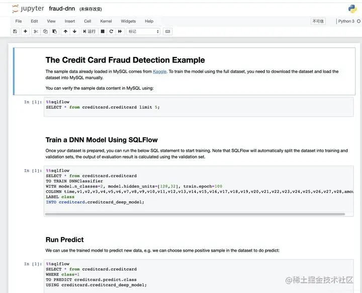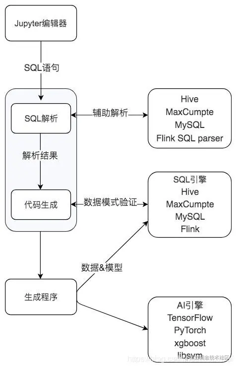 从上图中你能看出 SQLFlow 的使用过程,首先我们可以通过 Jupyter notebook 来完成 SQL 语句的交互。SQLFlow 支持了多种 SQL 引擎,包括 MySQL、Oracle、Hive、SparkSQL 和 Flink 等,这样我们就可以通过 SQL 语句从这些 DBMS 数据库中抽取数据,然后选择想要进行的机器学习算法(包括传统机器学习和深度学习模型)进行训练和预测。不过这个工具刚刚上线,工具、文档、社区还有很多需要完善的地方。