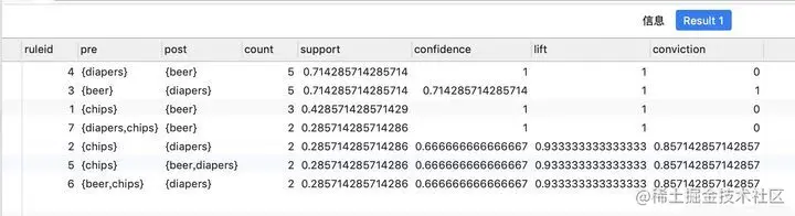 其中关联规则有 7 种,包括了购买 chips(薯条) 的人也会购买 beer(啤酒),购买 diapers(尿布)的同时也会 beer(啤酒) 等。