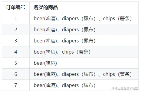 商品个数为 1 的频繁项集有 3 种,分别为 beer(啤酒)、chips(薯条)、diapers(尿布) 等;