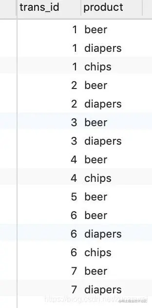 今天我们的数据集来自于一个购物样本数据,字段包括了 trans_id(交易 ID)以及 product(商品名称),具体的数据集参考下面的初始化 sql: