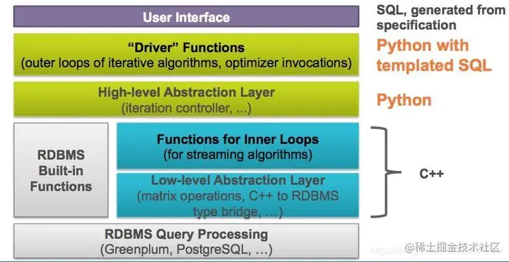 另外 PostgreSQL 是一个免费开源的关系数据库(ORDBMS),它的稳定性非常强,功能强大,在 OLTP 和 OLAP 系统上表现都非常出色。同时在机器学习上,配合 Madlib 项目可以让 PostgreSQL 如虎添翼。Madlib 包括了多种机器学习算法,比如分类、聚类、文本分析、回归分析、关联规则挖掘和验证分析等功能。这样我们可以通过使用 SQL,在 PostgreSQL 中使用各种机器学习算法模型,帮我们进行数据挖掘和分析。