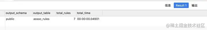 最后使用 SQL + MADlib 进行关联分析,这里我们设定了参数最小支持度为 0.25,最小置信度为 0.5。根据条件生成 transactions 中的关联规则,如下所示: