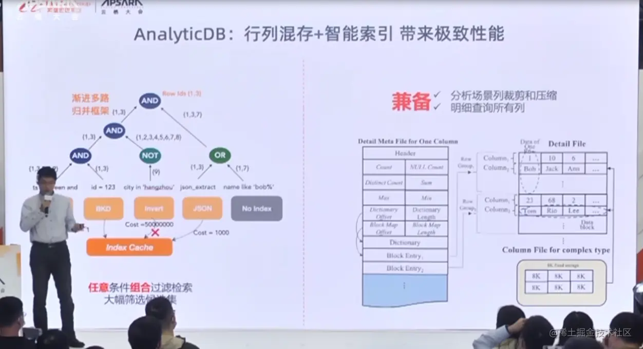 接下来,看一下我们明细查询。明细查询利用了AnalyticDB的智能索引能力。我们对于不同的数据类型有不同的索引。我们通过CBO来估算索引筛选率的高低,来决定是否使用索引。AnalyticDB根据不同的过滤条件使用不同的索引,最后渐进地多路归并返回查询结果的行号。我们内部的数据通过行列混存的方式进行存储,并且通过meta里面存储的粗糙集来进一步过滤数据。我们还用了字典编码来压缩字符串类型的数据。