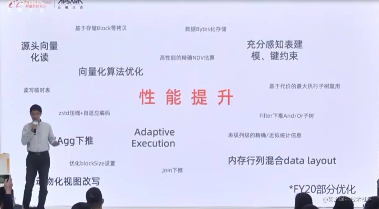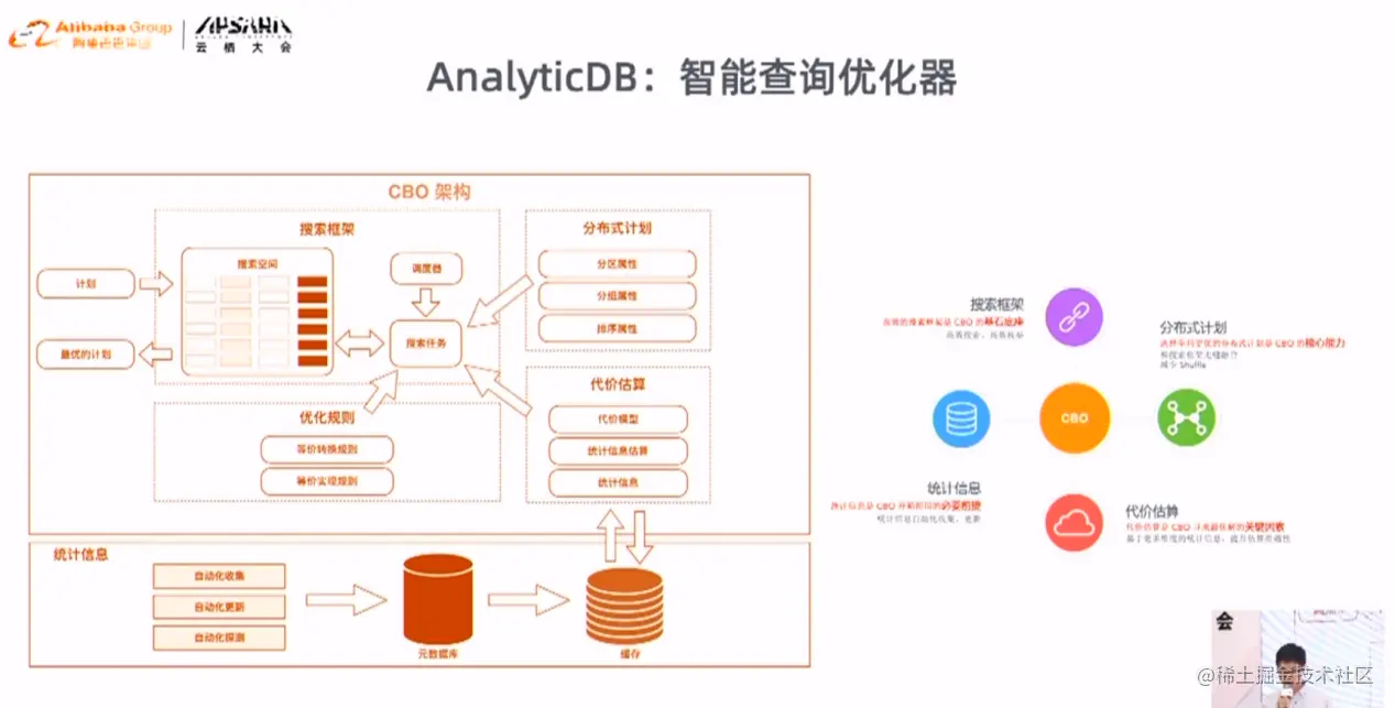 说完了计算和存储,再说一下优化器。我们实现了整套智能的优化。优化器分为两个部分,第一个部分是底层统计信息的采集部分。我们会根据查询条件,自动在某些列上采集统计信息。第二,我们会在规定的时间内通过Cascades的框架搜索出最优的执行计划,我们用一套优化器支持了整套离在线的查询。并且我们的优化器,不仅对接了AnalyticDB内部的数据源,还支持了外部的例如存储在OSS、HDFS上的数据源。做到了湖仓一体的查询优化。